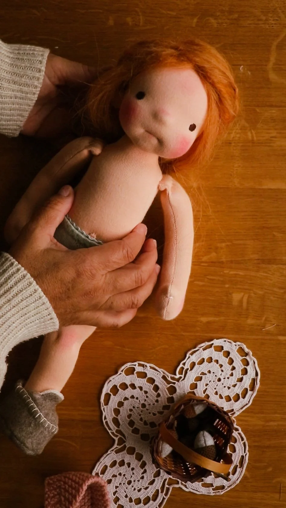 Amelie is finally ready to go home and meet all her sisters. I think she is also a little sad to say good bye to the apple trees, and the funny chickens. But I know, even though she tries to hide it, that she is in fact very much excited about her starting life. She tries to look a little somber every now and then, as to not hurt my feelings, but I can see the twinkle in her eyes, the eagerness to pack her clothes, the silly giggles with Eva. I don't blame her, or hold it against her of course, but some days I do wish I could keep each and every single doll I make and never have to say good bye to them.