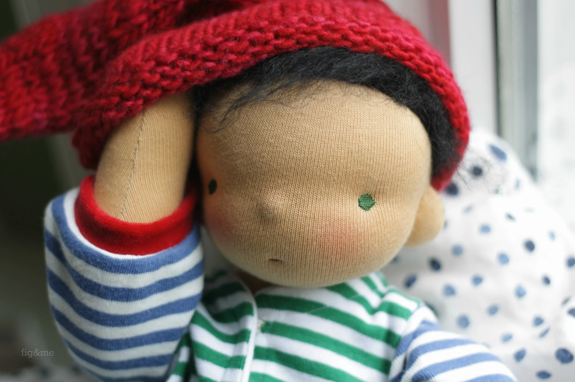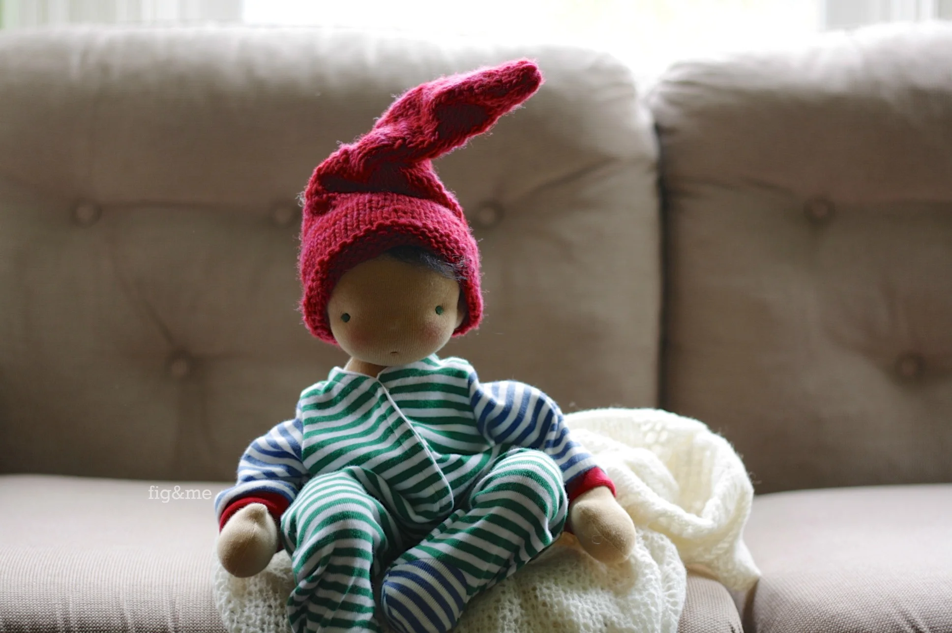 Baby Thorpe is a natural handmade doll. He is made with my baby pattern which has curved legs and arms, and long fabric joins (not joints) so that he has a lot of movement. He is made with swiss jersey and stuffed with clean wool. His hair is mohair yarn (DollyMo in black), and his face is embroidered. He is wearing a cotton interlock sleeper that closes with hand-sewn snaps. He also has a matching diaper with velcro tabs and a hand-knit stocking cap made with Manos del Uruguay hand-dyed wool yarn. He is about 14" tall, but it is hard to measure him because of his bent limbs. Thorpe is a natural doll recommended for a child 3+ who can dress and undress a doll with ease. He is not heavy so he is very easy to carry and his arms and legs were sewn to his body securely by machine.
