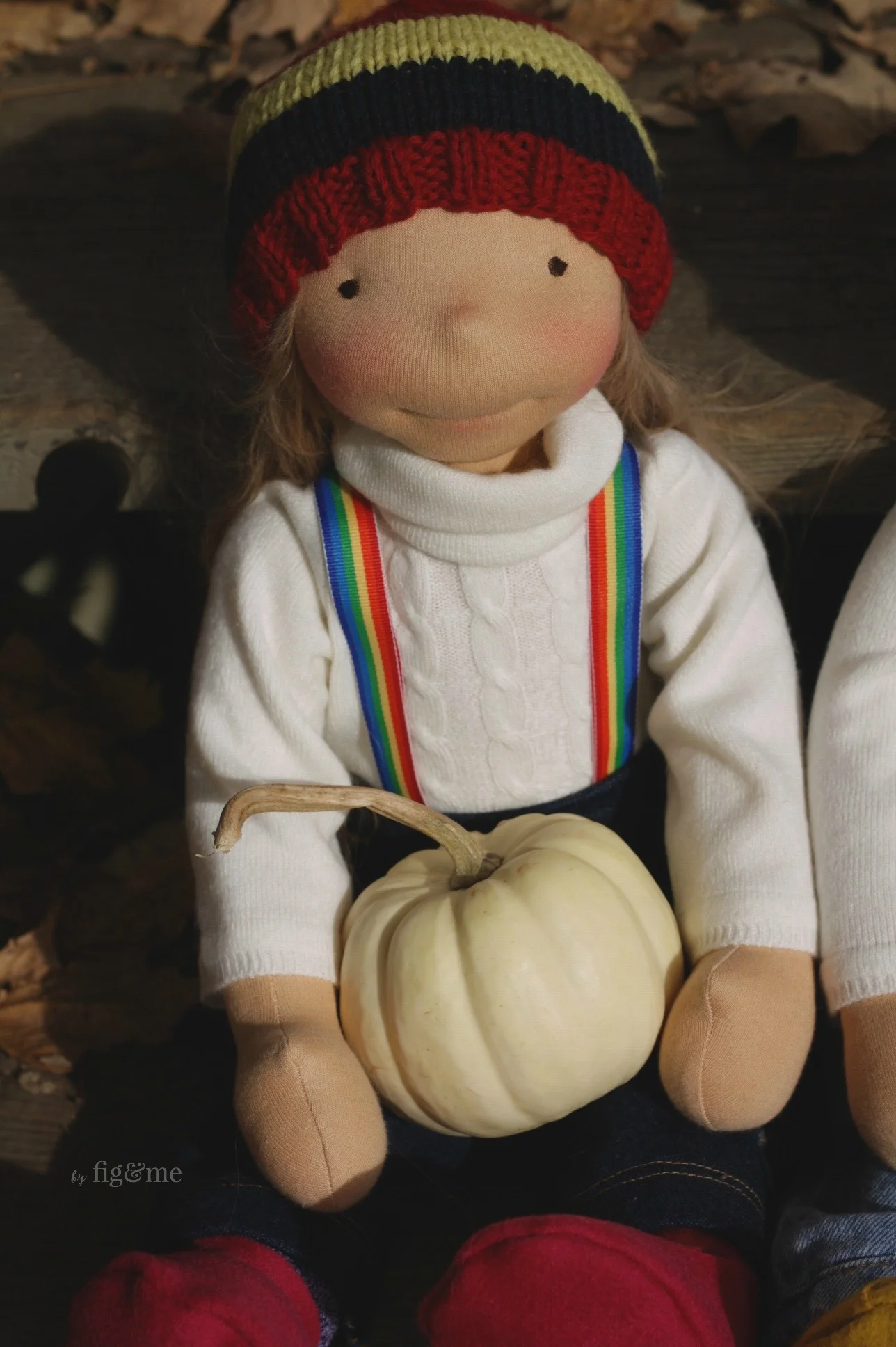 The one thing that kept ringing in my head, was their Mom describing Tonja as her rainbow. And then there were the suspenders. Oh you should have seen how I walked into a few stores with a crazy face, trying to find the right size of ribbon to make them. I just HAD to make them. Because Tonja really is a rainbow, she might not know this but she is. Please don't tell her, it will be our inside joke (and please don't tell her how much it bugs me that I sewed the suspenders the other way around…with the orange/red to the inside instead of the outside…a dollmaker notices these things!). I gave them hats because it is getting chilly and I can't take dolls outside in good conscience without dressing them up properly. I always shiver when I look at them with their "empty" heads. Then they wanted to go and pick their own little pumpkin for Halloween and who am I to say no?.