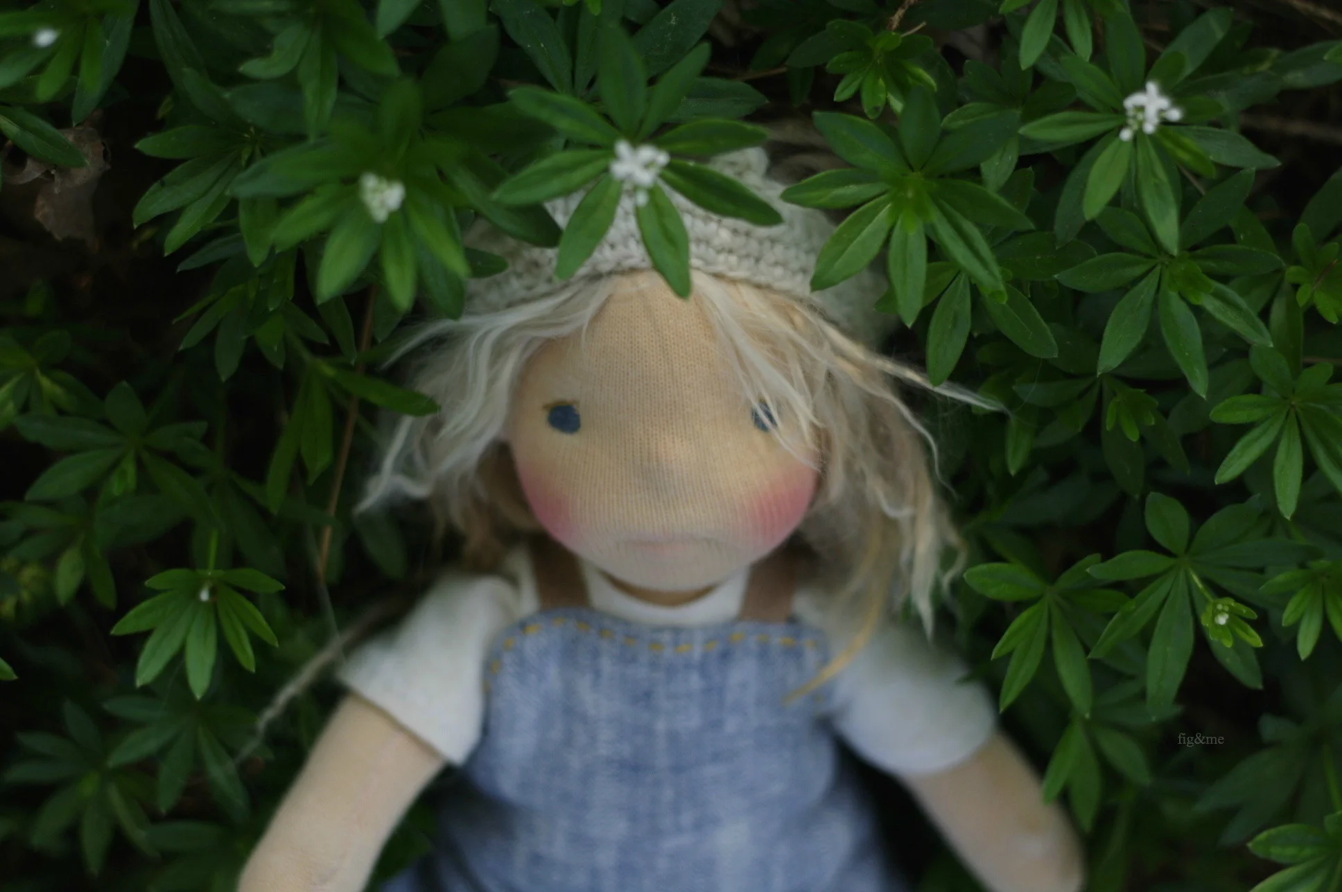 Thea is also one of a kind. I have never made a doll like her, with her 4 year old proportions and chubby-esque figure. She has string jointed arms, and her hair is made of suri alpaca locks sewn into wefts and crochet into a cap. Her facial features are needle-felted. She wears a cotton double-knit top, overalls, socks and shoes. She has a wool crown, a cotton cape and a little kerchief for when she needs to clean her tree house. She measures about 8.5” tall.