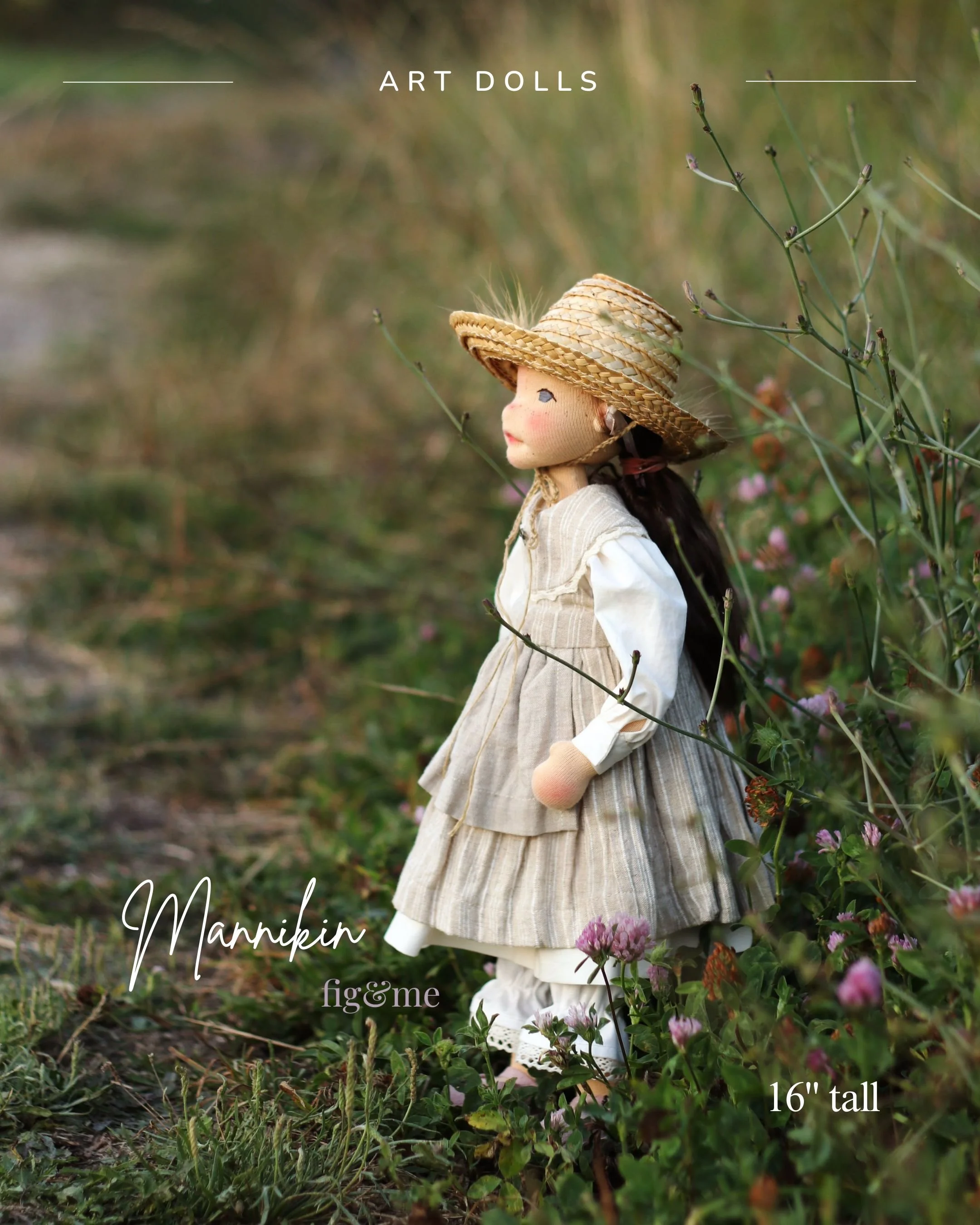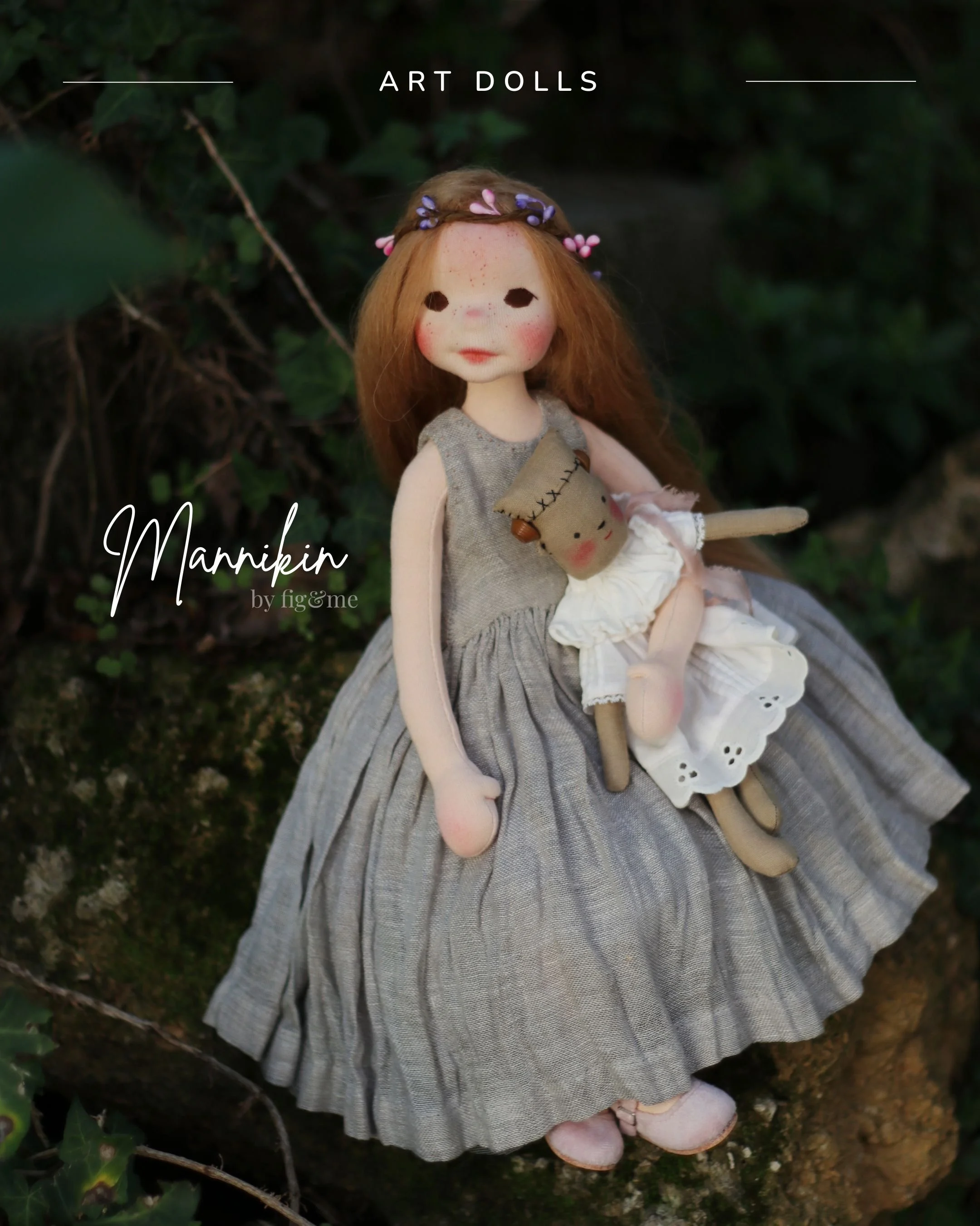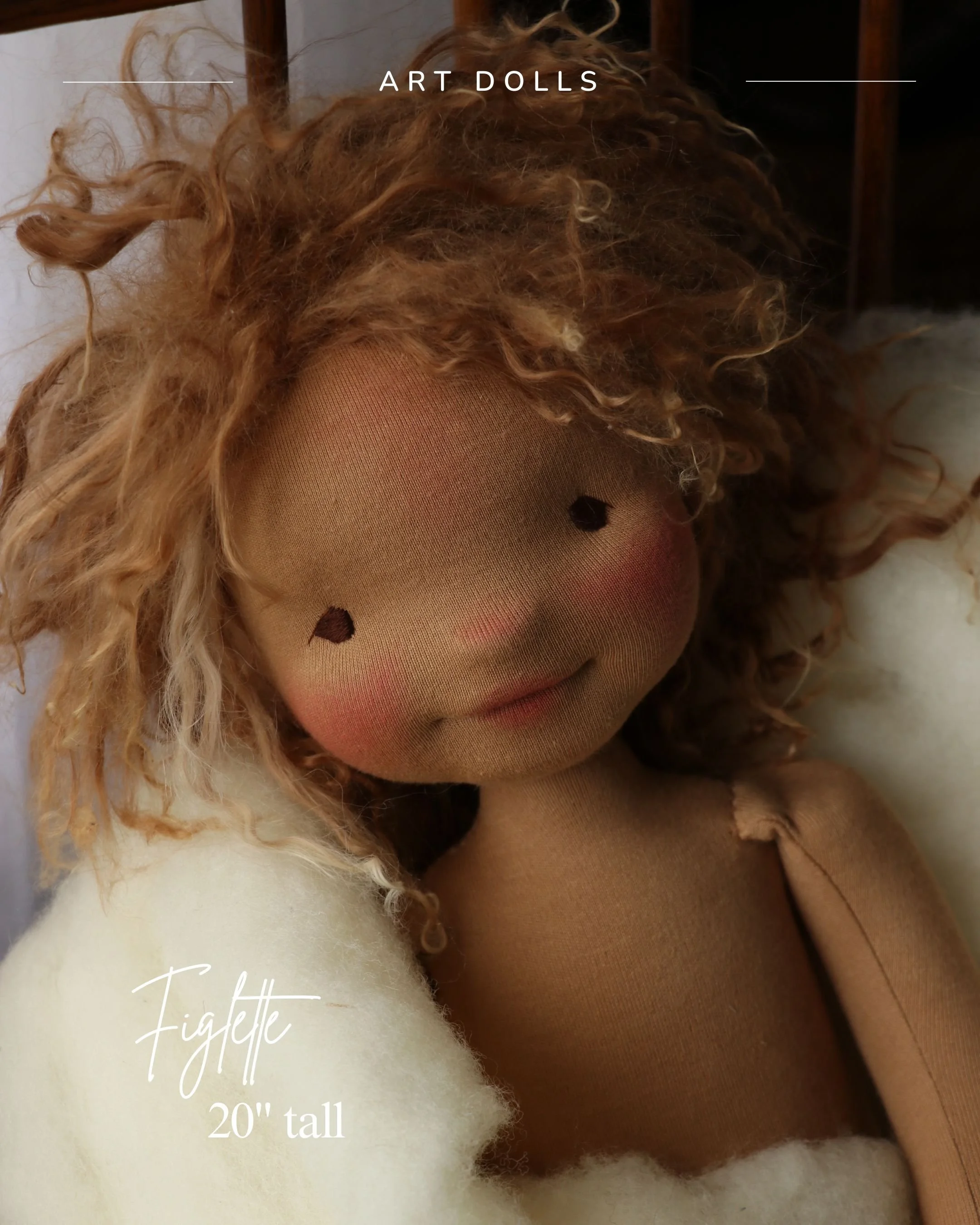The Figlette is the pattern I created based on the body proportions of my then 5 year old. It is the doll pattern that made me feel confident enough to call myself a dollmaker, back in 2011, therefore I can’t quite bring myself to stop making dolls with it, though every year I adapt a little here or there to suit my evolution as a dollmaker. Figlettes are partially stuffed and their heads and torso are sculpted, the heads do not rotate like my other dolls, and I consider this pattern to be more child-friendly due to their size and construction.