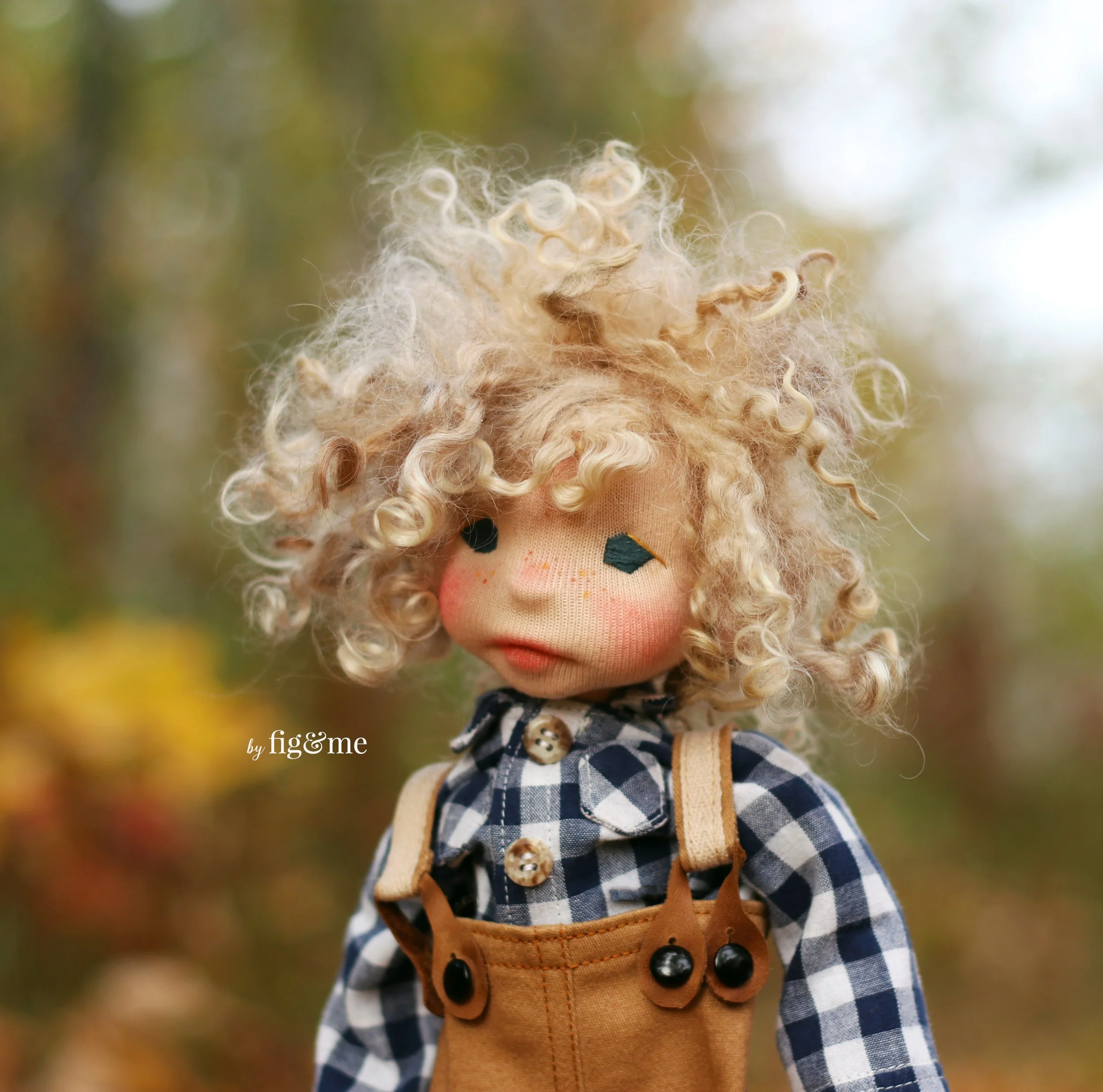 His hair is made with Suri Alpaca locks and dollmaking mohair yarn. His eyes are embroidered and freckles hand-painted.
