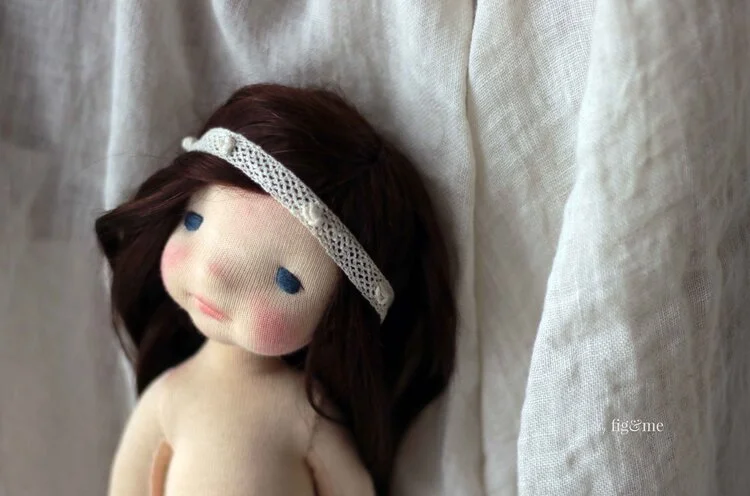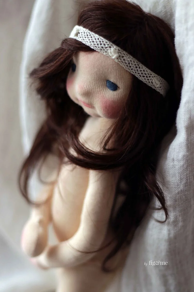 Her eyes are embroidered with cotton floss and her hair is mohair weft, that can be styled, braided, etc. She really likes to use a curling iron!