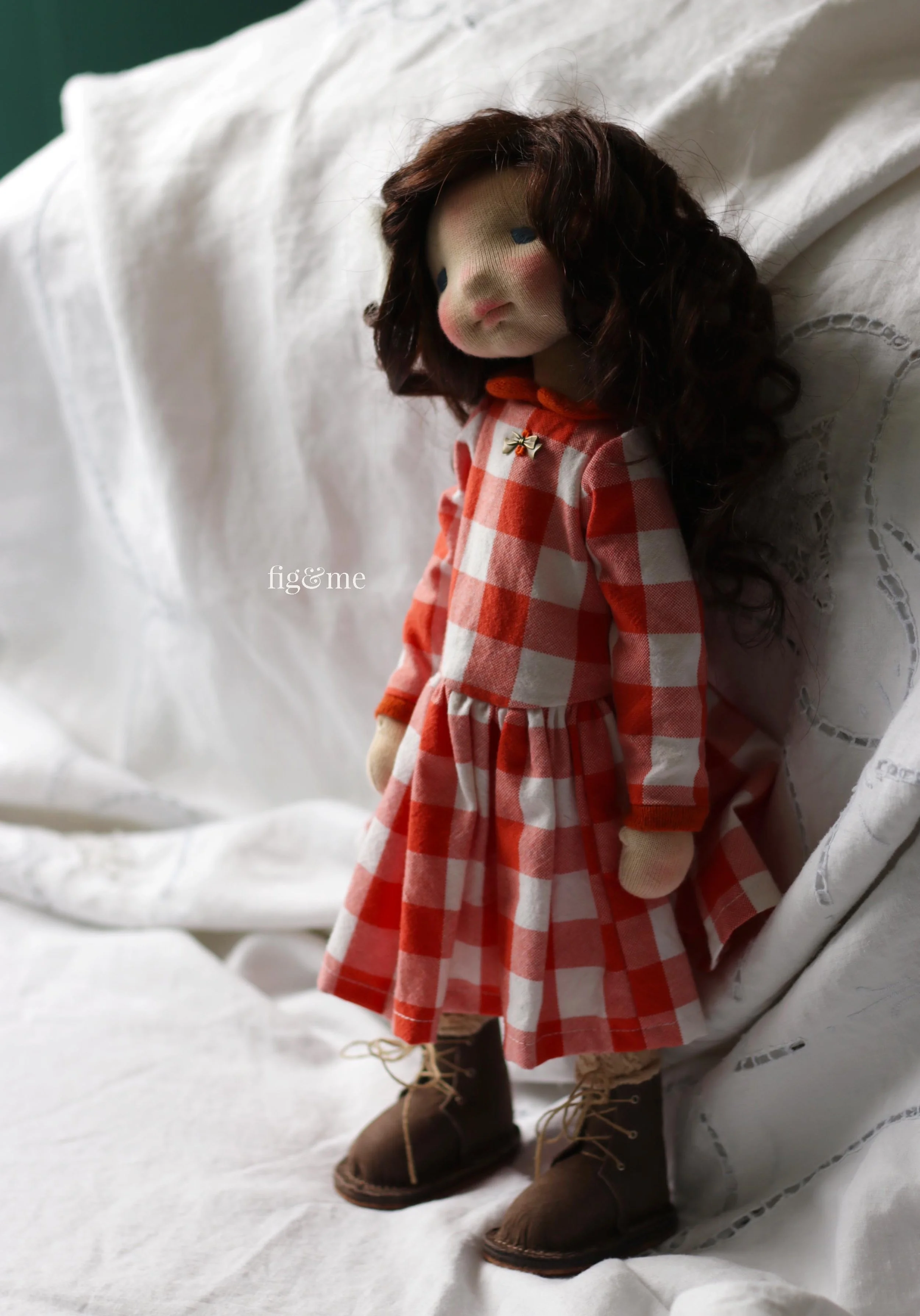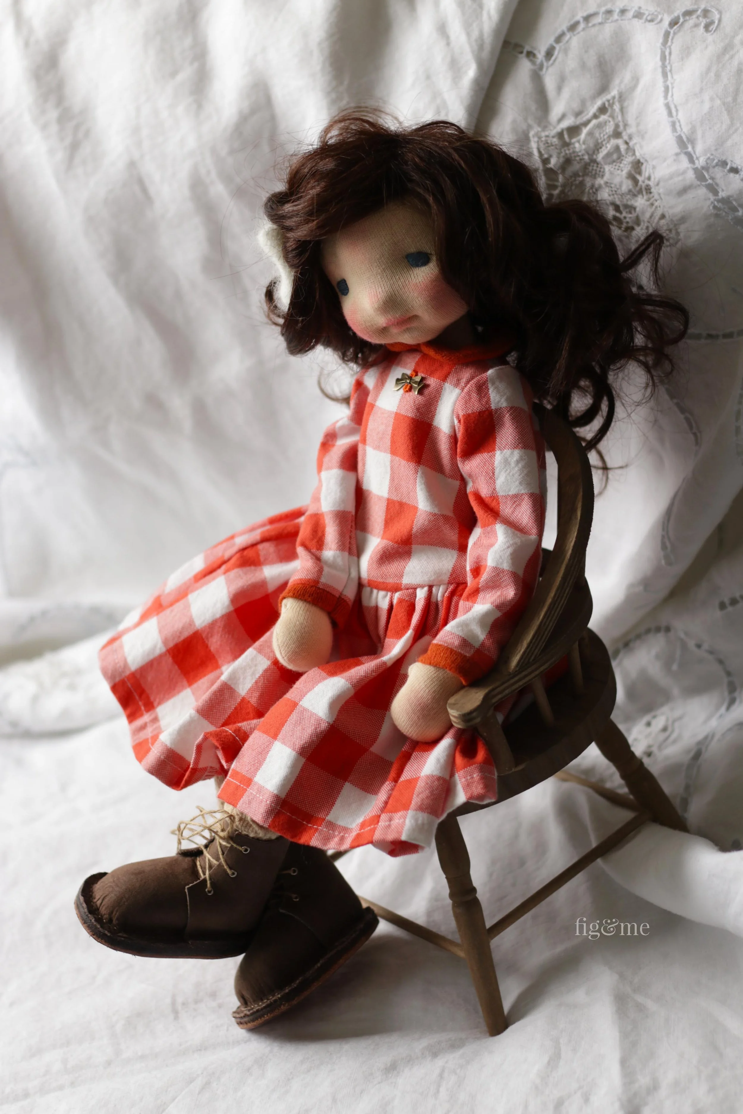 As her Fall outfit, she wears a cotton long dress with buffalo check in orange and white. With cashmere cuffs and collar, that closes at back with sewn-in snaps. The dress is decorated with a brass bow.