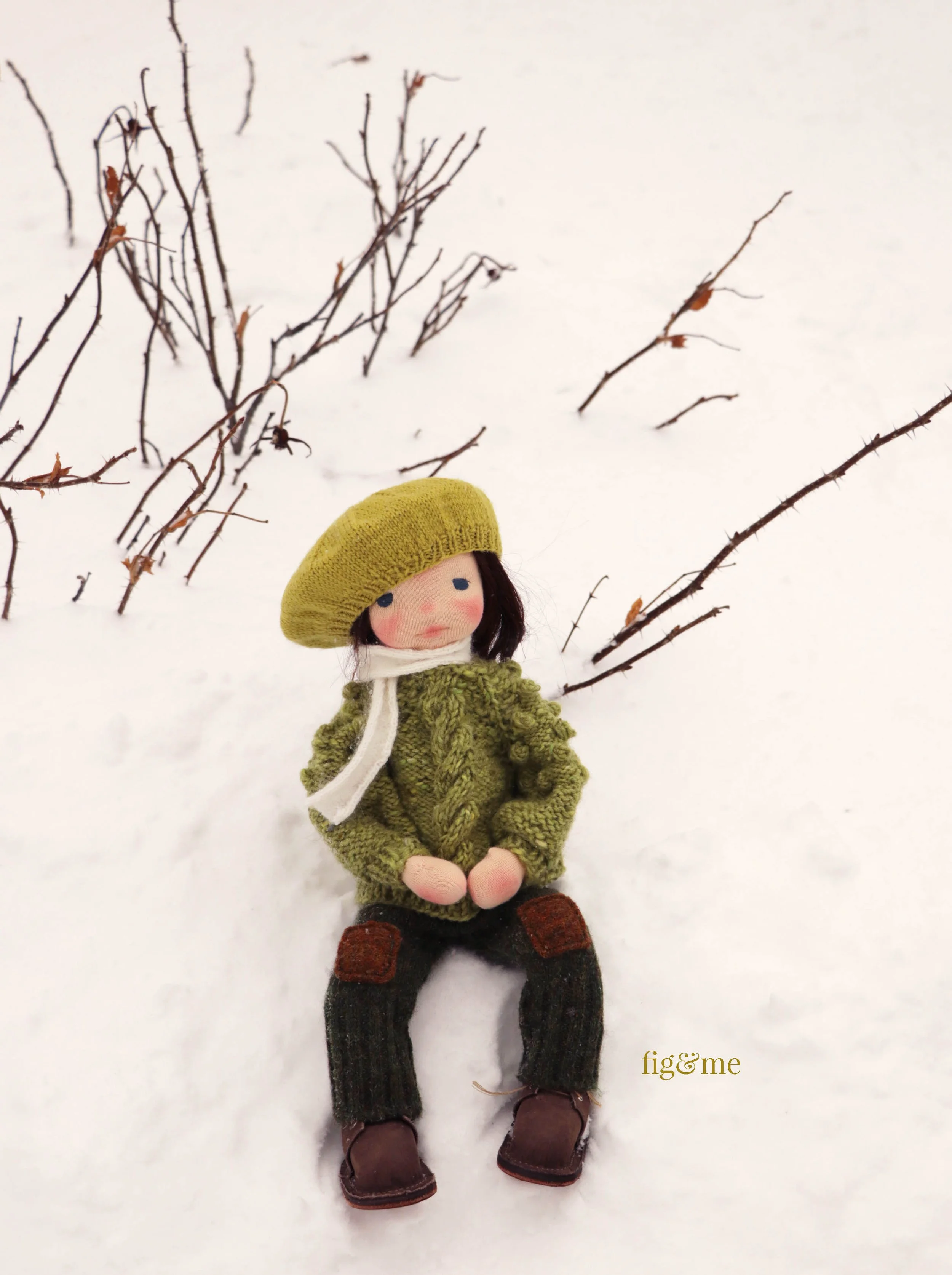 For her winter outfit she wears a pair of speckled virgin wool long pants (they go all the way to her chest) with knee patches. Her hand knit aran sweater was knitted with Donegal tweed wool, her angora scarf and her hand knit beret was made in wool.