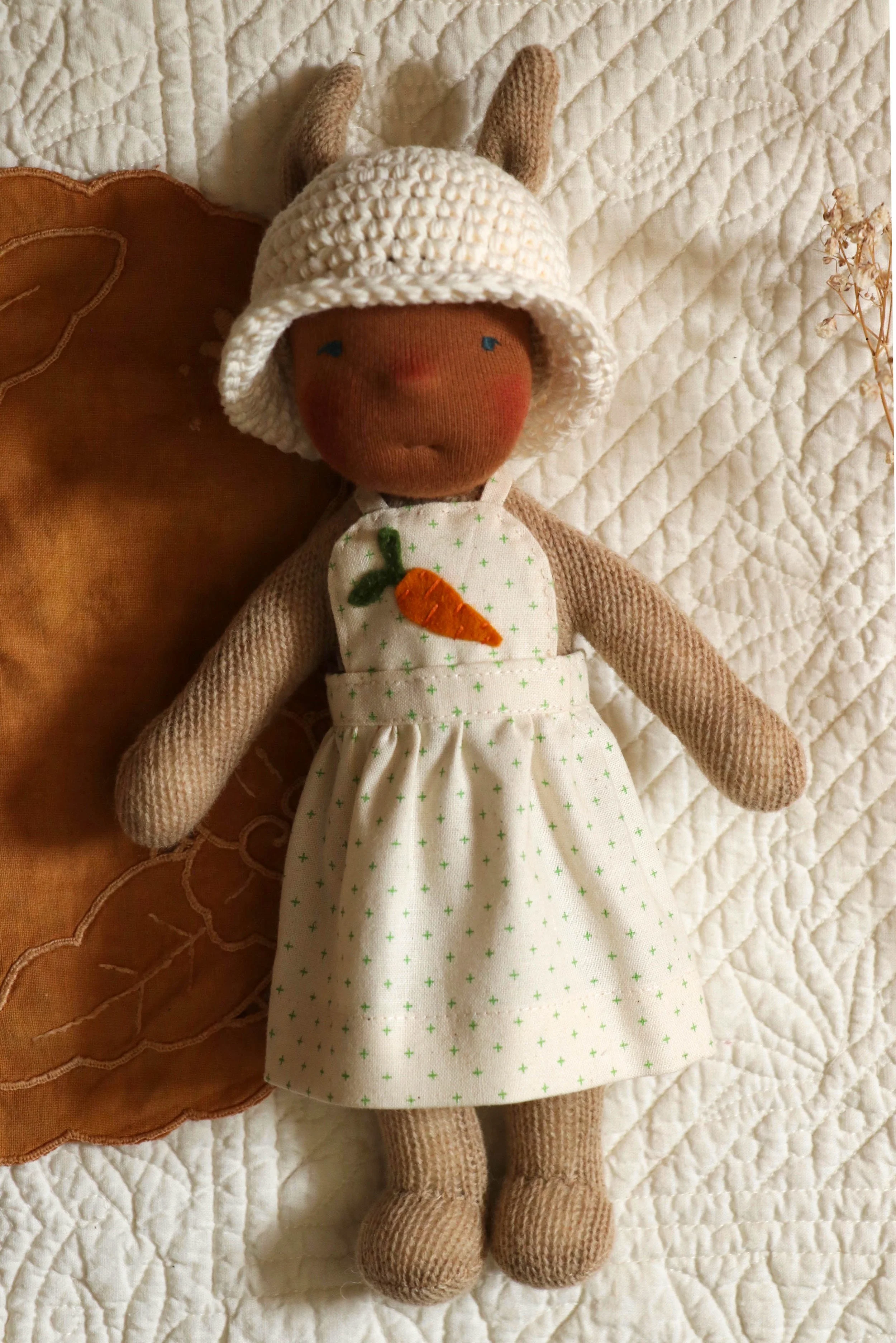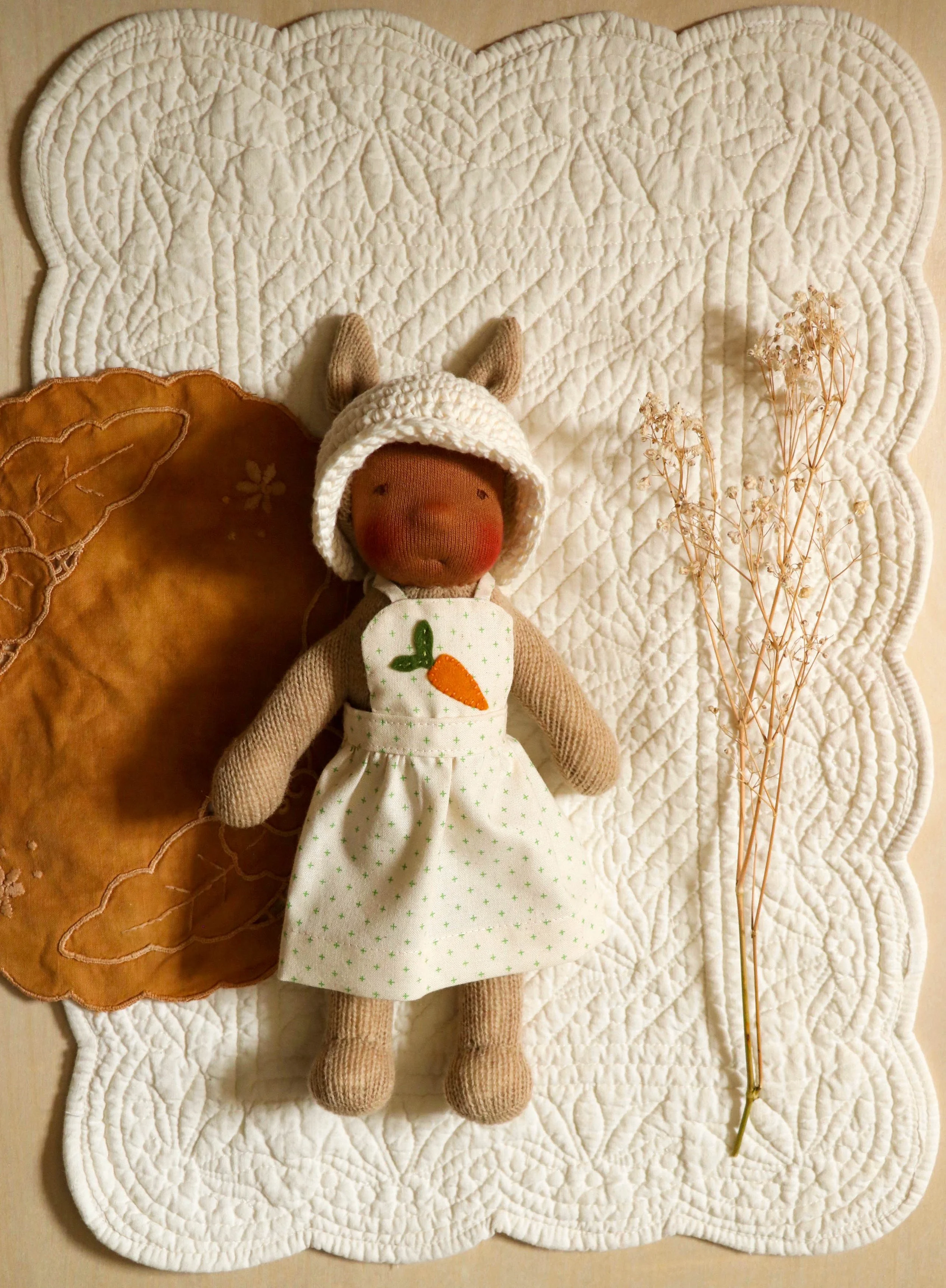 As I was making the chest part of their pinafore I had the vision of a tiny little carrot. I wondered if I was going to embroider six little carrots…because though I love embroidery and look for any opportunity to add it to my dolls’ clothing, I was feeling like the aprons wouldn’t look right with embroidery.