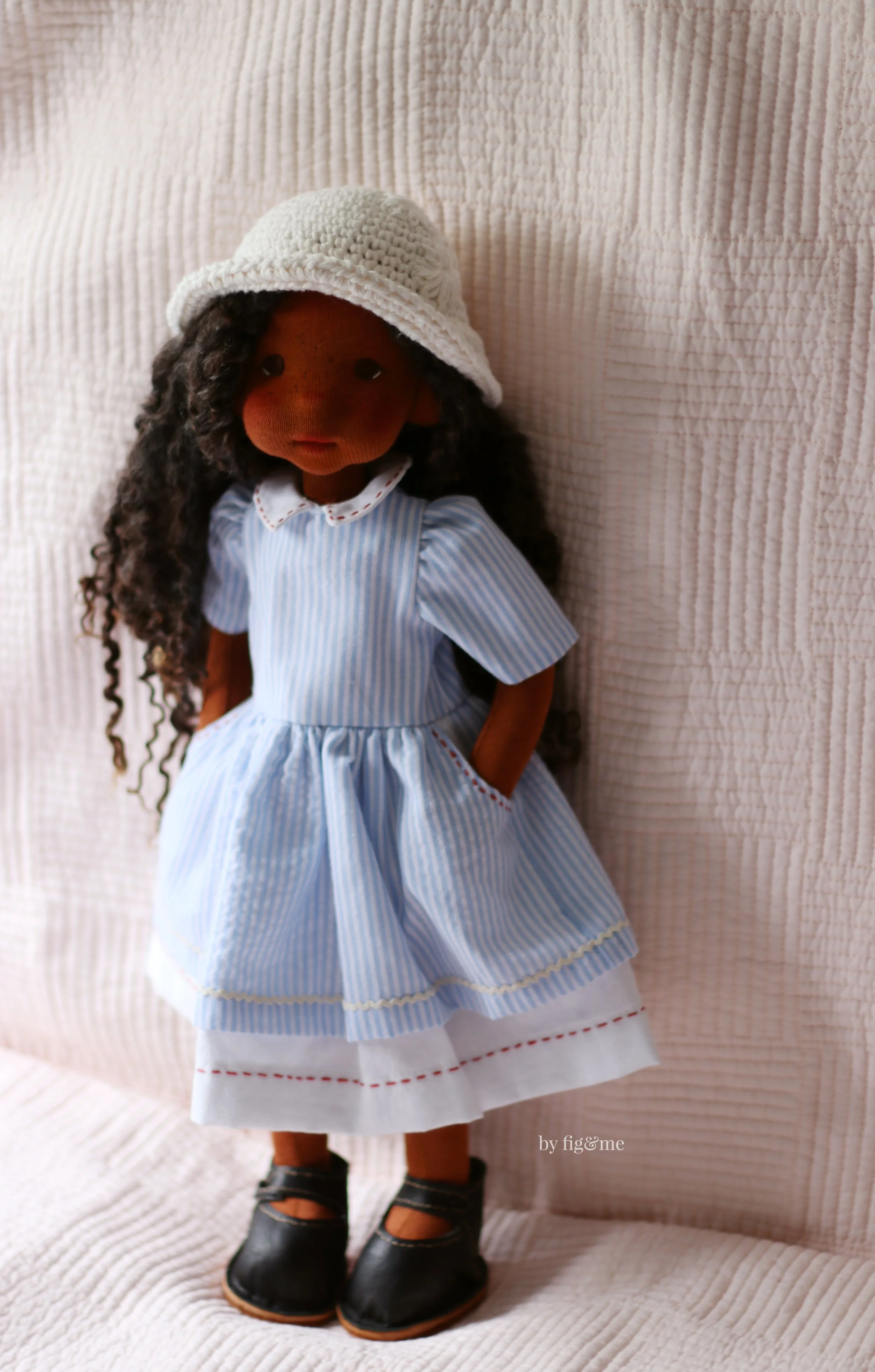 I made her another dress in blue seersucker. The perfect fabric for the warm weather she is heading into. A white starched collar and red stitching seemed to be just the thing this outfit needed.