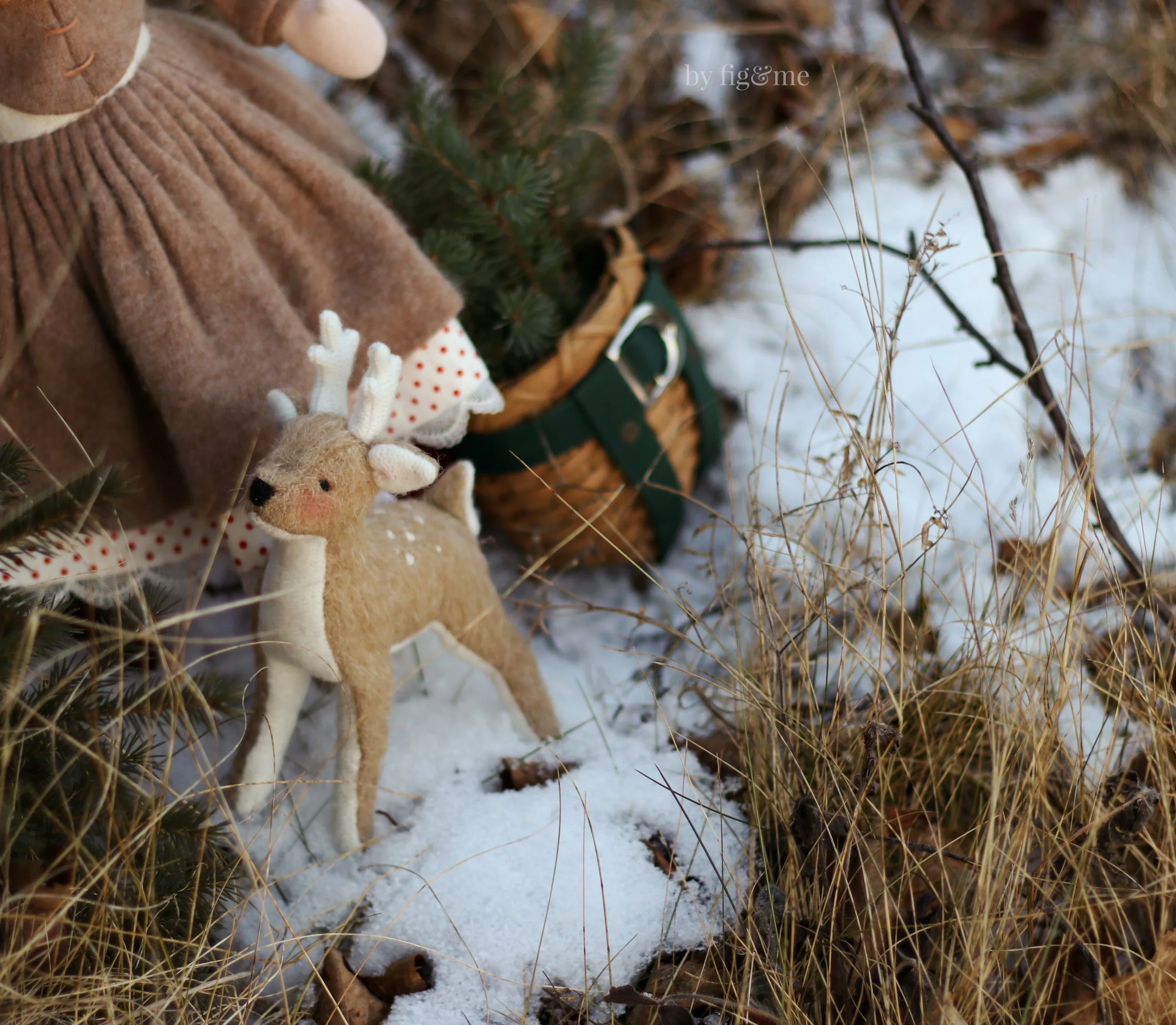 She comes wearing the outfit you see her in (check previous post for more views of her undergarments). A cotton voile set of ‘combinations’, with lace and elastic, plus sewn in snaps at back. A bodice and skirt in 100% italian cashmere (upcycled fabric). The skirt is cartridge pleated, is lined with red polka dot underskirt trimmed in lace. She has long socks, red boots in cashmere with leather ties, a fake fur stole lined with cashmere and a fabulous headband (antlers are made of paper clay and have wire inside).
