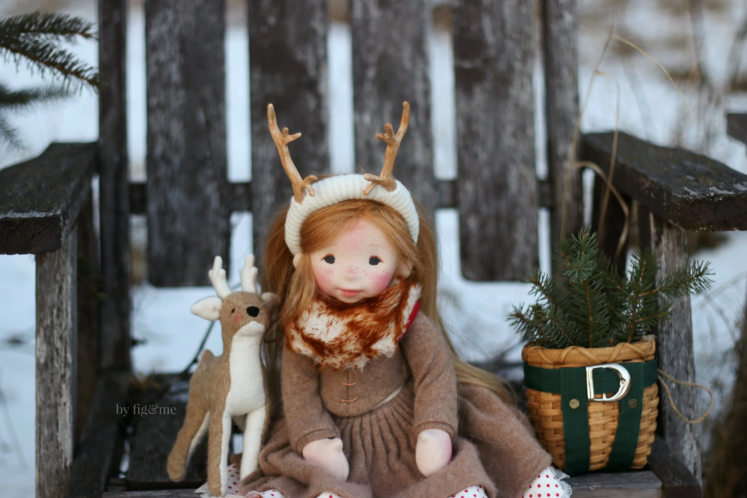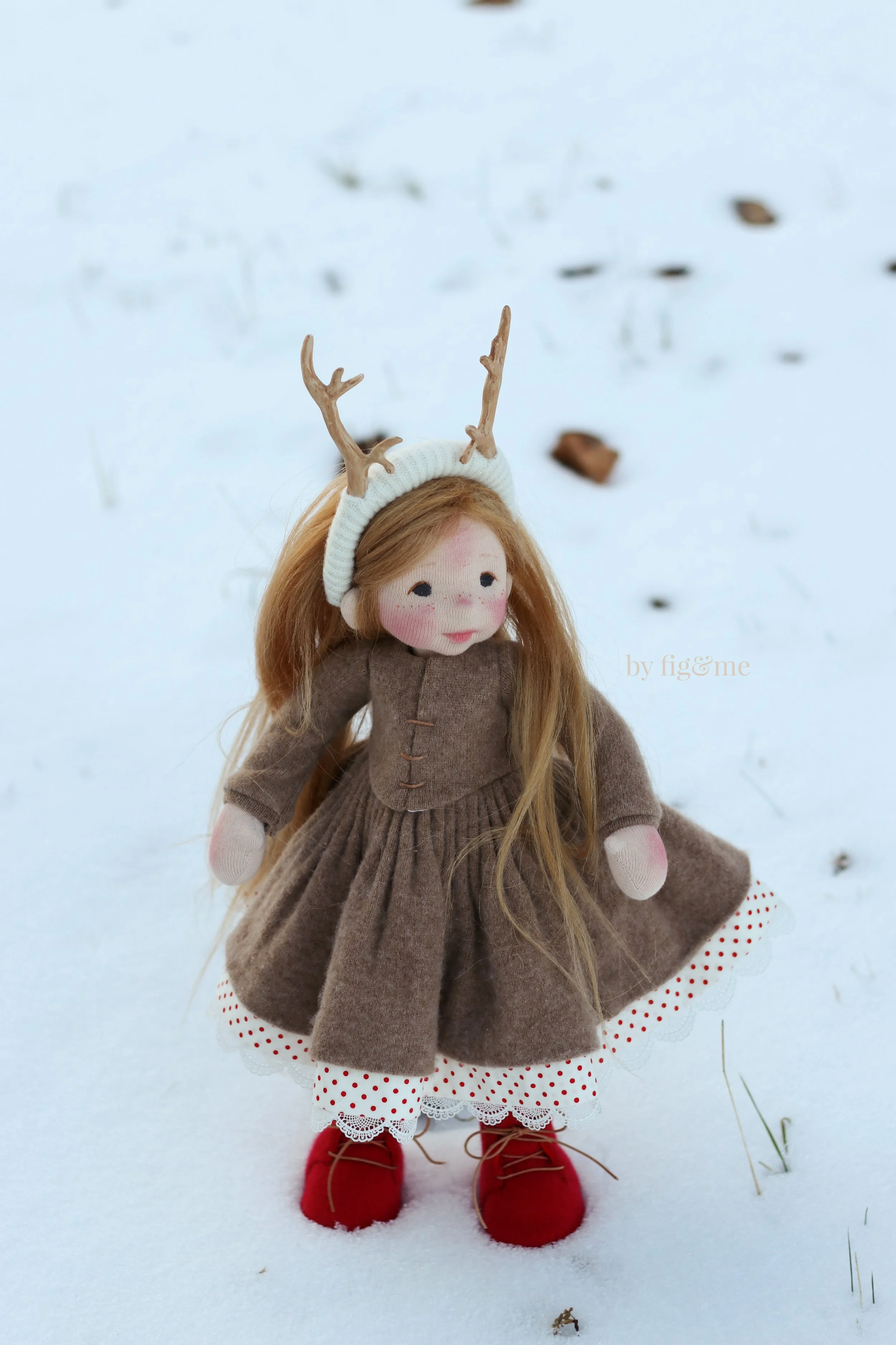 Ainur of House Staghorn is a 16” tall natural fiber art doll, made in my petite fig pattern. She is weighted with glass beads in her tummy, stuffed and sculpted in wool and her hair is made of camel and mohair fiber. Her head rotates in all directions, she can stand assisted and is very playful. Her eyes are embroidered and her freckles and eyebrows are hand painted.